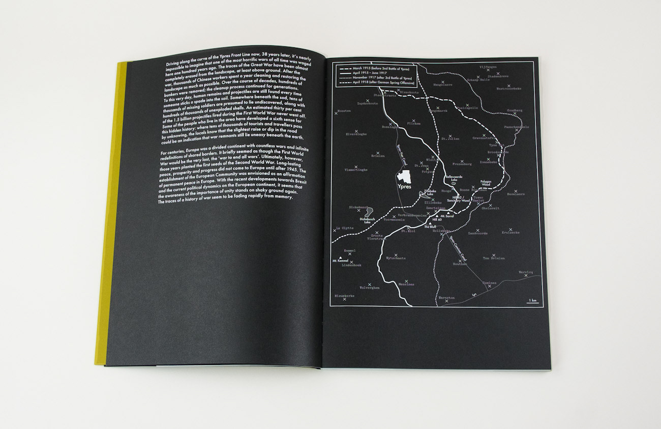 Driving along the curve of the Ypres Front Line now, 38 years later, it’s nearly impossible to imagine that one of the most horrific wars of all time was waged here one hundred years ago. The traces of the Great War have been almost completely erased from the landscape, at least above ground. After the war, thousands of Chinese workers spent a year cleaning and restoring the landscape as much as possible. Over the course of decades, hundreds of bunkers were removed; the cleanup process continued for generations. To this very day, human remains and projectiles are still found every time someone sticks a spade into the soil. Somewhere beneath the sod, tens of thousands of missing soldiers are presumed to lie undiscovered, along with hundreds of thousands of unexploded shells. An estimated thirty per cent of the 1.5 billion projectiles fired during the First World War never went off. Some of the people who live in the area have developed a sixth sense for this hidden history: where tens of thousands of tourists and travellers pass by unknowing, the locals know that the slightest raise or dip in the road could be an indication that war remnants still lie uneasy beneath the earth.